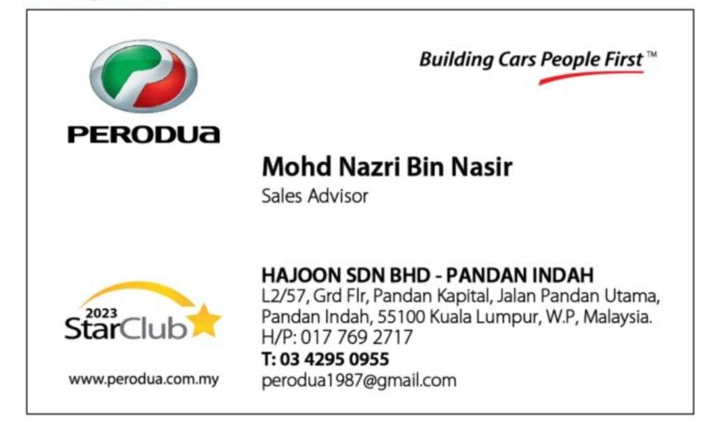 Hai! Nama saya Mohd Nazri, Sales Advisor Perodua Ampang Jaya yang sah. Berpengalaman lebih 10 tahun dalam bidang jualan kereta di Malaysia.